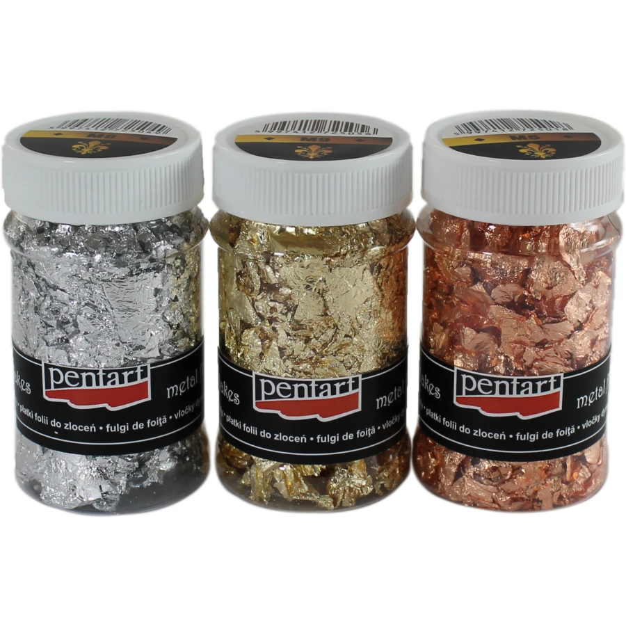 Bardzo cienka warstwa kolorowej folii z metalicznym połyskiem, którą należy przykleić do powierzchni za pomocą kleju Tacky Glue lub Metal Leaf Glue. Płatki dostępne są w 11 kolorach, w tym w trzech kolorach mieszanych.