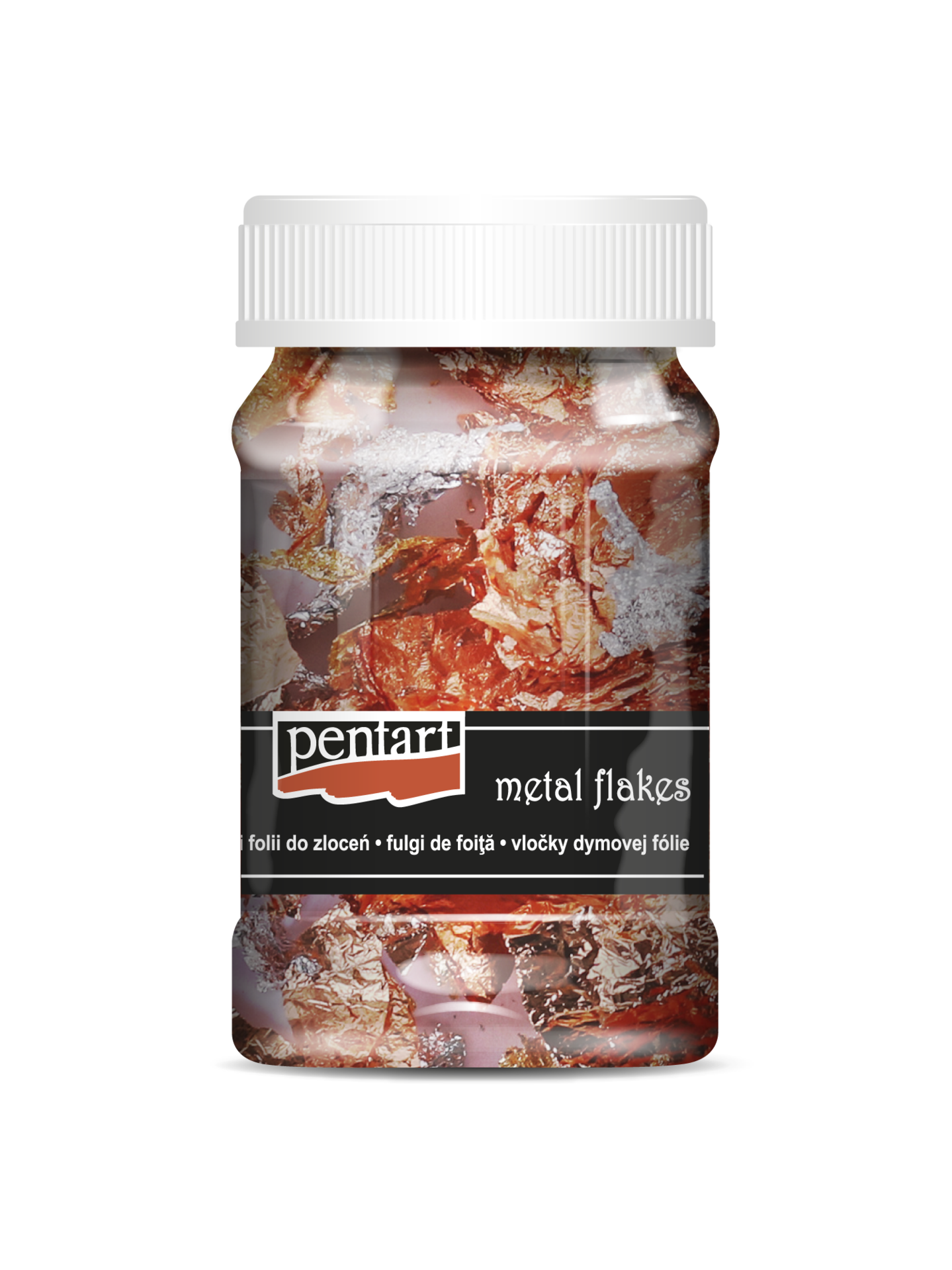 Bardzo cienka warstwa kolorowej folii z metalicznym połyskiem, którą należy przykleić do powierzchni za pomocą kleju Tacky Glue lub Metal Leaf Glue.