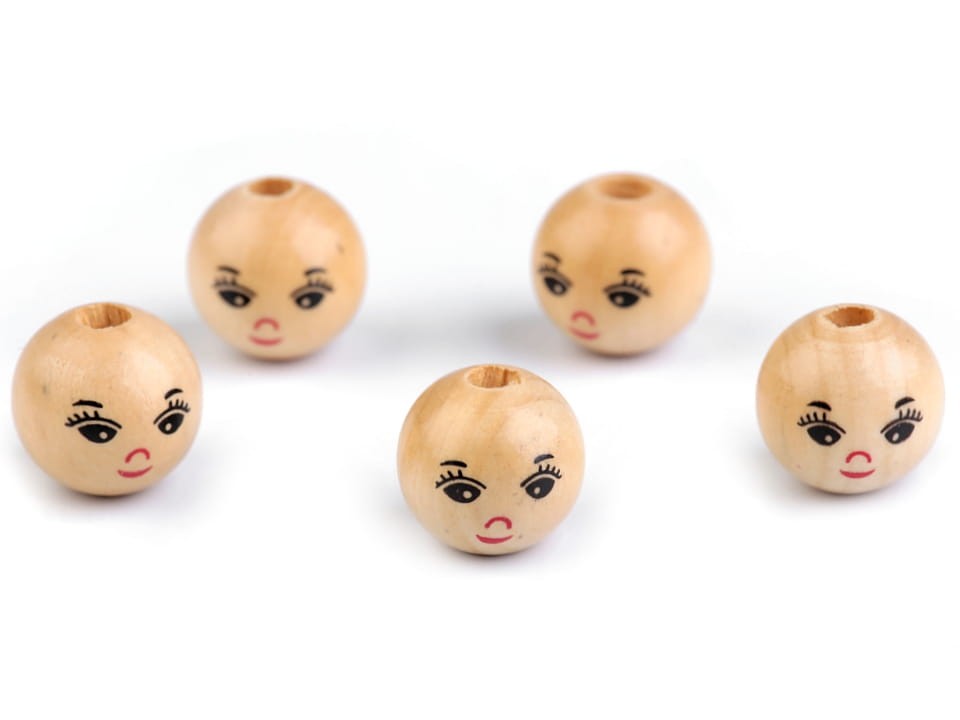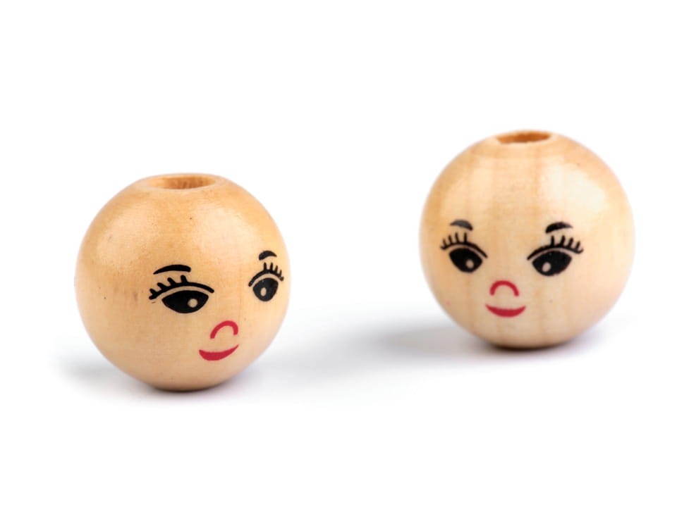 Małe drewniane koraliki z malowaną buźką mają delikatny połysk dzięki lakierowaniu.