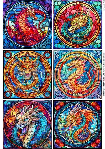 Papier do decoupage w rozmiarze A4 (210 x 297 mm) przedstawiający medaliony ze smokami.