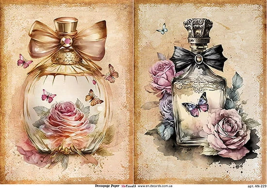 Papier do decoupage w rozmiarze A4 (210 x 297 mm) przedstawiający flakon z perfumami.