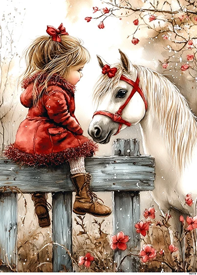Papier ryżowy A6 Dziewczynka w czerwieni z koniem (16773)