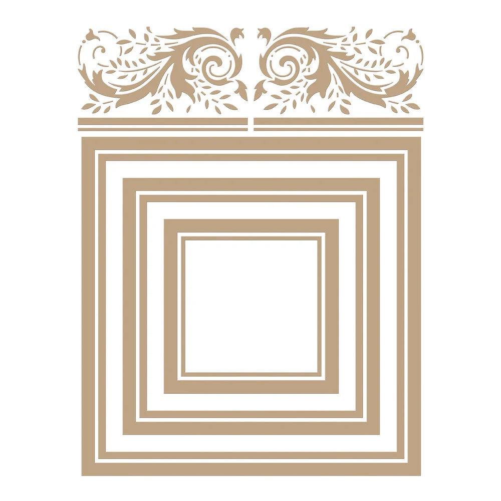 Crowned Rimmed Squares to zestaw pięciu płytek, w skład którego wchodzą trzy kwadraty z podwójną linią i dwa lustrzane wzory z rozkwieconymi wzorami z podwójnym obramowaniem u dołu każdego z nich.