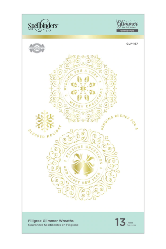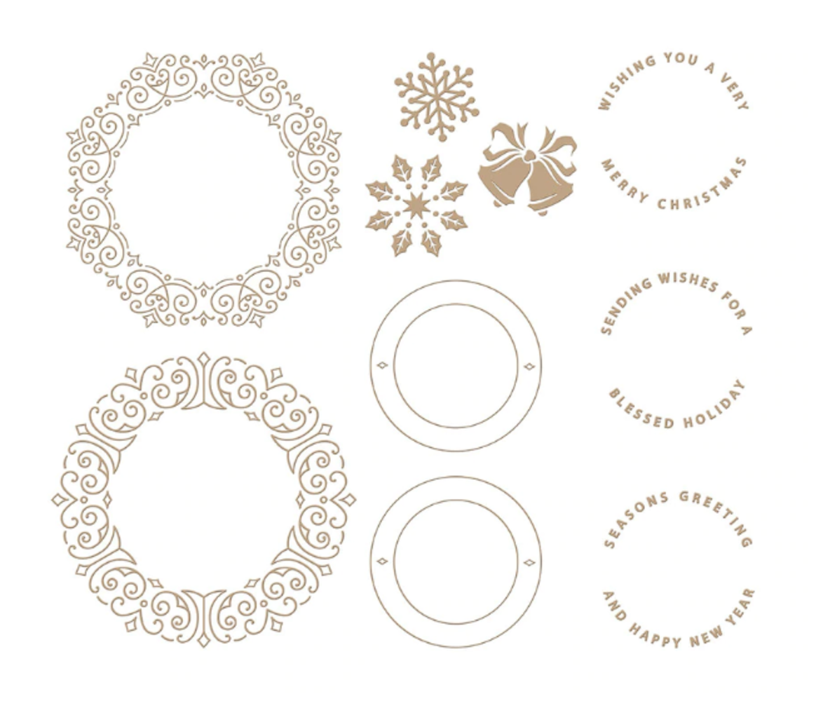 Płytka do złoceń Filigree Glimmer Wreaths to zestaw 13 płytek, który zawiera dwa ozdobne wzory wieńców, dwa kształty pierścieni, trzy sentymenty pasujące do pierścieni i trzy motywy świąteczne.
