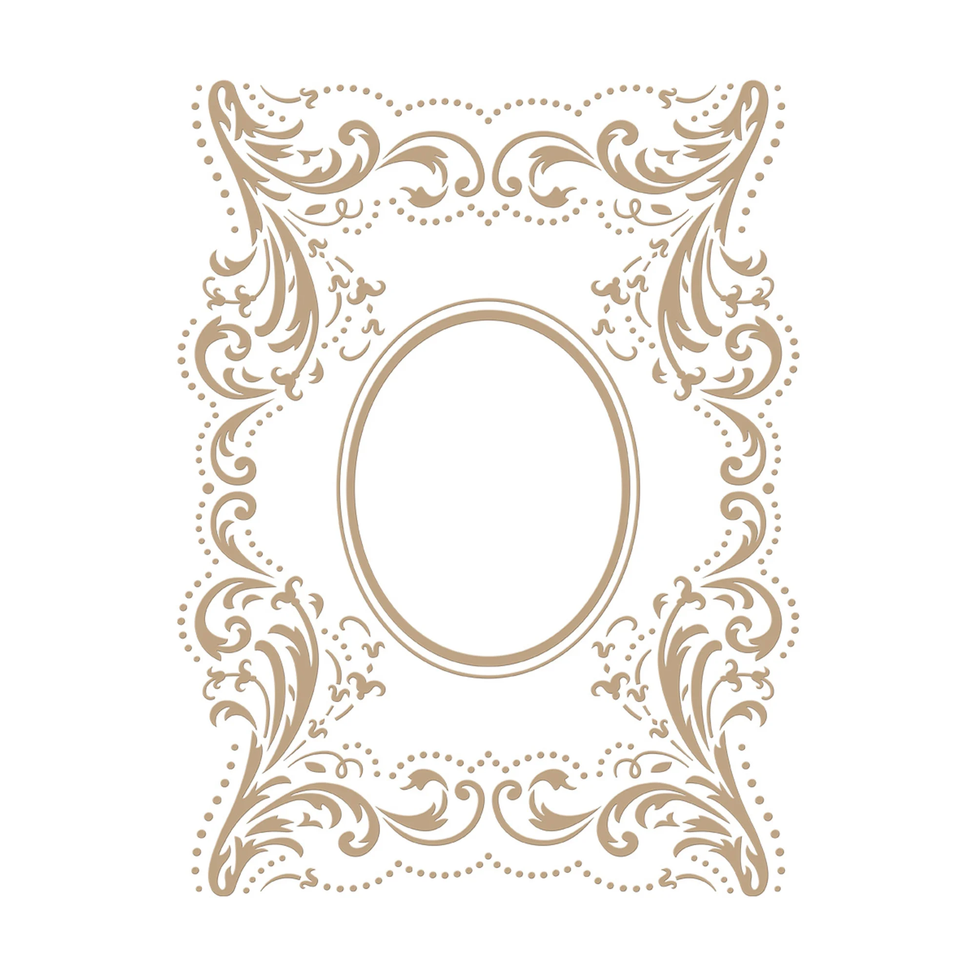Contessa's Seal Panel to zestaw dwóch płytek, który zawiera oszałamiającą dużą ramę z ozdobnymi kwiatowymi wzorami otoczonymi delikatnymi kropkami. Druga płytka ma owalny kształt, który mieści się w środku większej ramy.