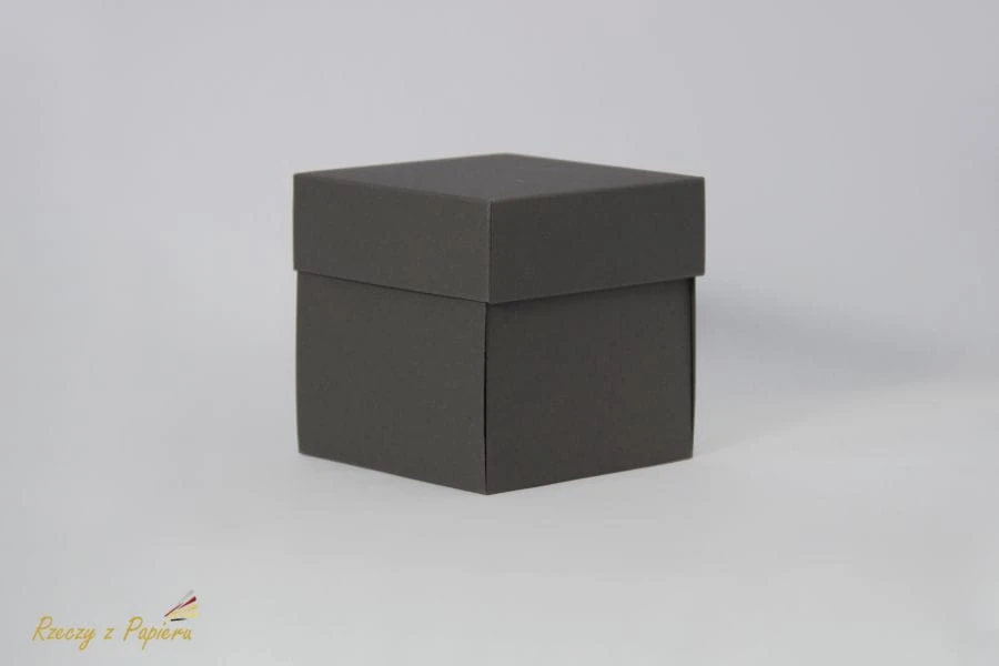 Rozmiar 10x10x10cm, wieczko wys. 3,5 cm. Wykonane z szarego papieru offset, bezdrzewnego o gramaturze 300gm2.