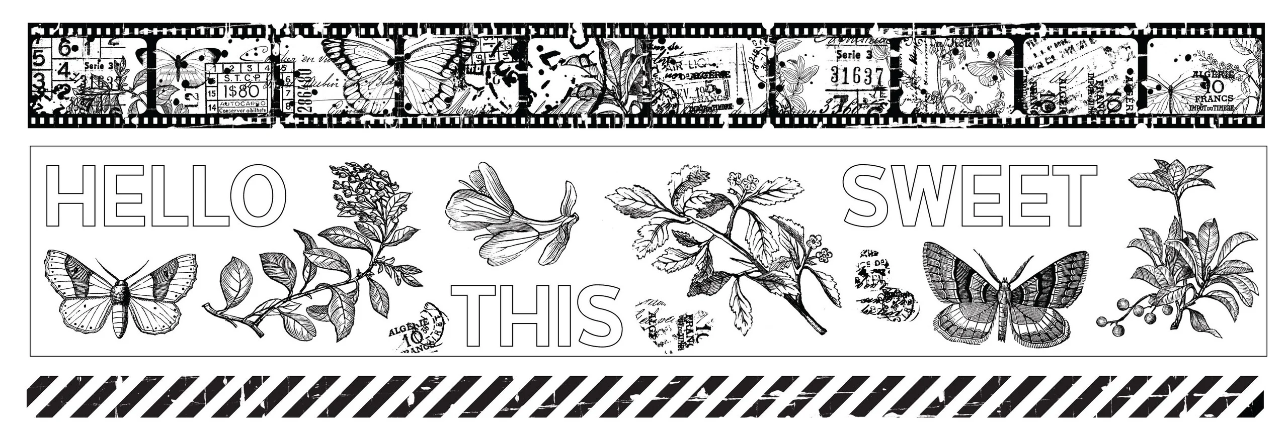 Dwie rolki mają ciągłe wzory – jedna w paski, a druga w paski filmowe – co zapewnia maksymalną elastyczność cięcia dokładnie tam, gdzie jest potrzebne. Trzecia rolka to taśma z elementami ciętymi na zasadzie „kiss-cut” wypełniona motylami, sentencjami i motywami botanicznymi, co ułatwia warstwowanie i podkreśla punkty centralne.