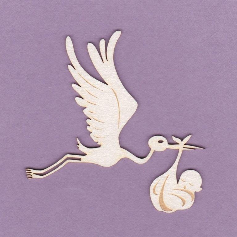 Tekturka przedstawiająca bociana niosącego dziecko.