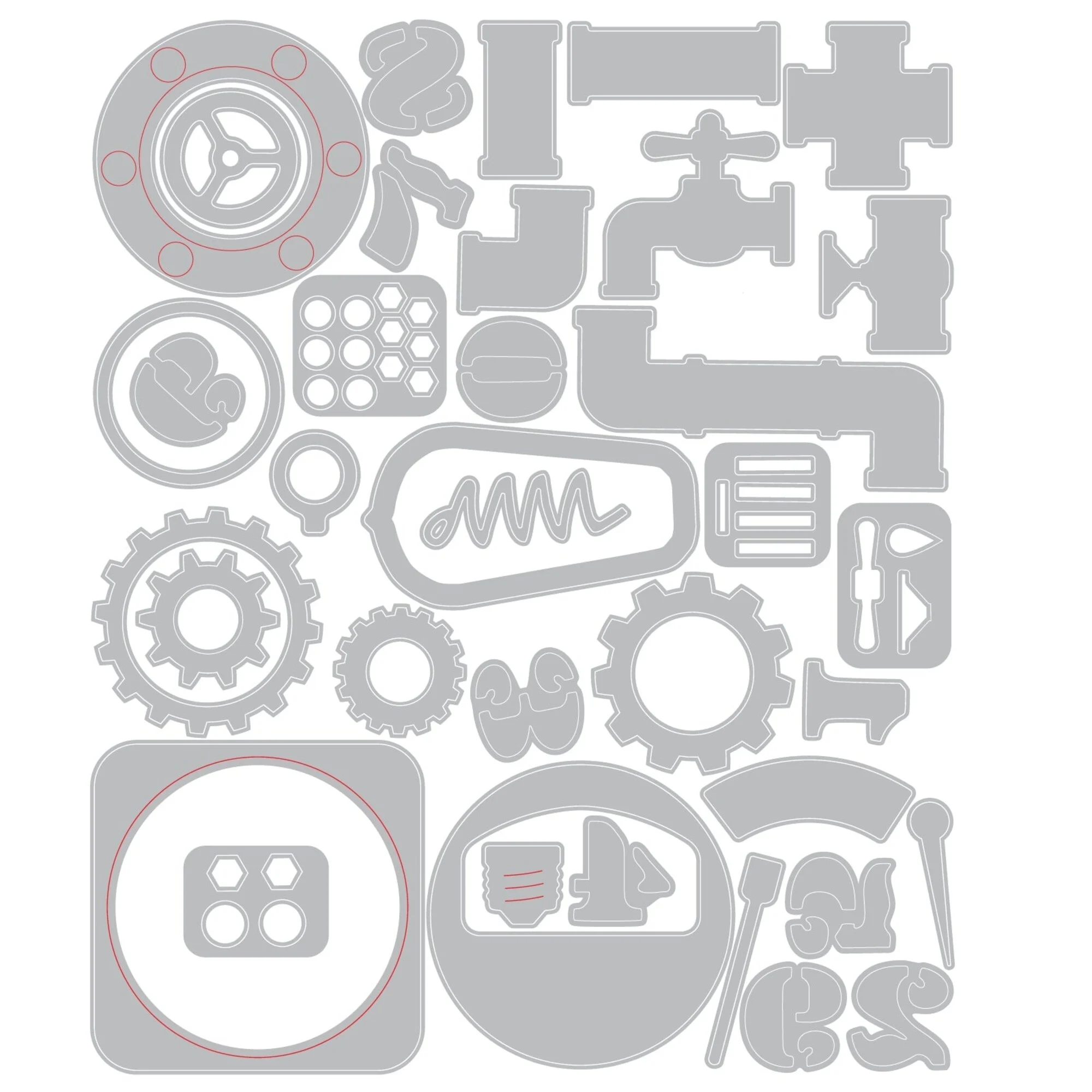 Ten wszechstronny zestaw wykrojników zawiera szereg starannie wykonanych elementów, w tym misterne kształty, takie jak wskaźniki, żarówki, rury, koła zębate i cyfry, idealne do dodania Twoim dziełom odrobiny pomysłowości.