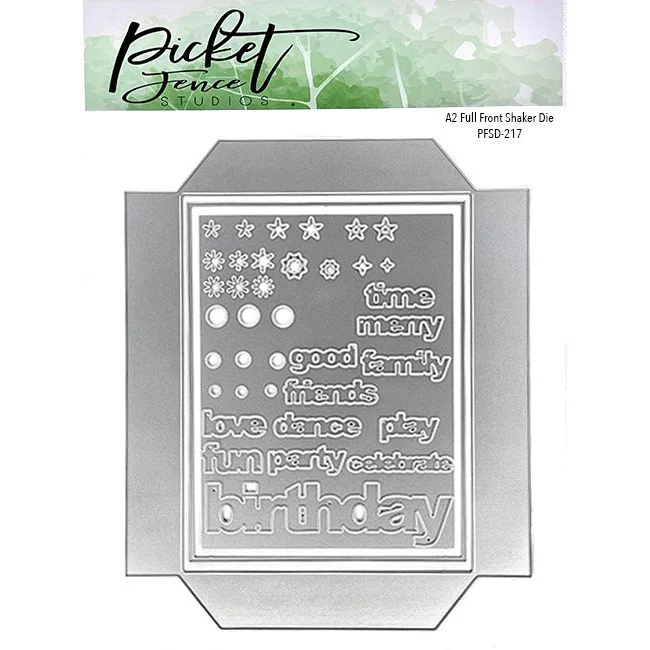 Wykrojnik A2 Full Front Shaker z czterema liniami bigowania i czterema krawędziami tnącymi. Łącznie 3 wykrojniki, wycinają 27 kształtów i zawierają 12 słów.