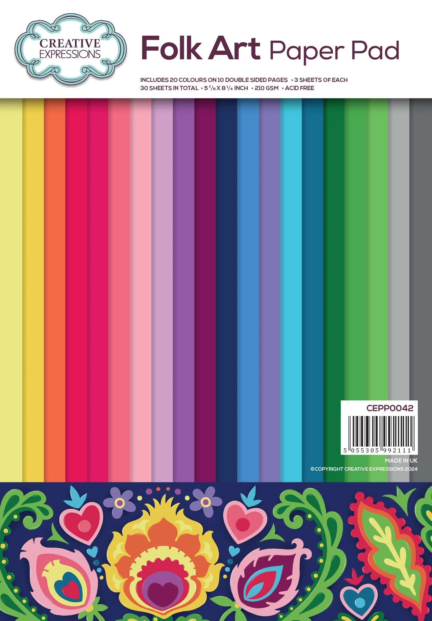 Zestaw papierów "Folk Art" to bloczek 30 arkuszy z 20 kolorami na 10 dwustronnych stronach po 3 arkusze na każdej.