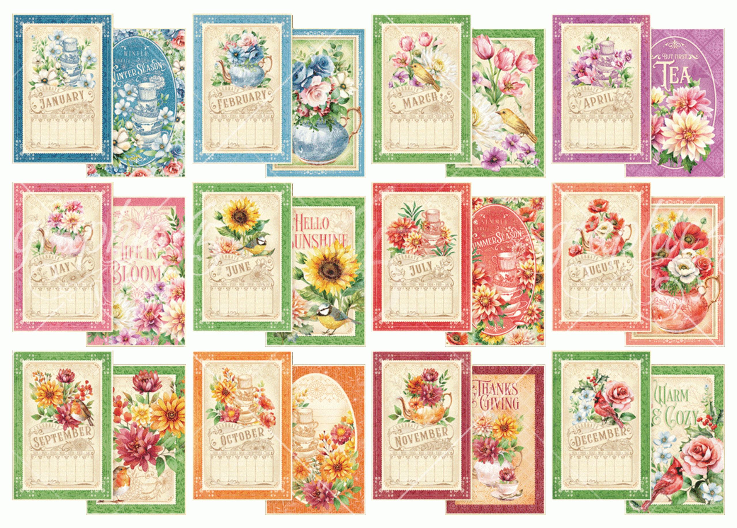 Zestaw zawiera 24 pięknie zaprojektowane karty 4×6 cali (dwa z każdego wzoru) z kolekcji Season to Celebrate. Posiada unikalny wzór na każdy miesiąc w roku.
